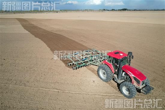 2023年4月12日,整地机通过北斗卫星导航系统精准定位在察布查尔锡伯自治县海努克镇切吉村进行平整土地作业(无人机拍摄)。