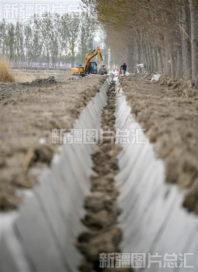 2023年4月12日,施工人员在察布查尔锡伯自治县扎库齐牛录乡一处高标准农田进行修整水渠作业。