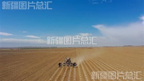 2023年4月13日,博乐市小营盘镇托里布拉格东村种植基地,种植户驾驶播种机播种食葵(无人机拍摄)。