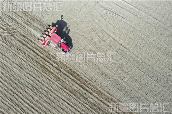2023年4月13日,新源县则克台镇阔克英村村民在大田里播种玉米(无人机拍摄)。