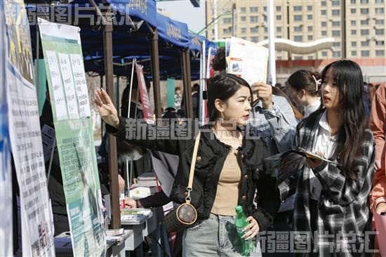 2023年4月13日,参加乌鲁木齐职业大学专场招聘会的学生了解企业招聘信息。