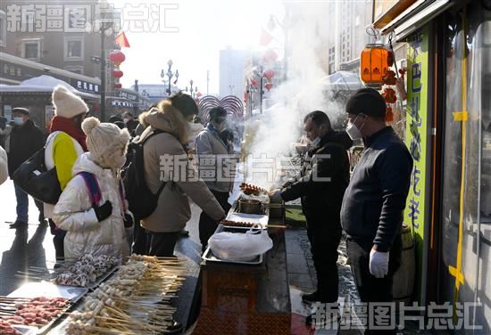2023年1月26日,游客在新疆国际大巴扎步行街品尝美食。