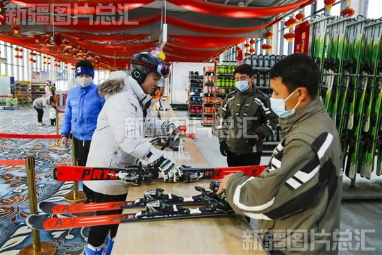 2023年1月24日,位于洛浦县丝路滑雪场接待大厅内,游客正在领取雪具。