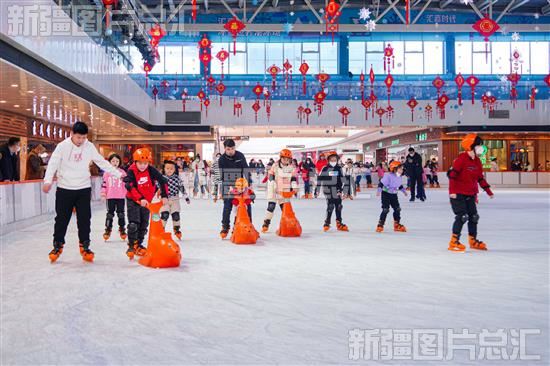 2023年1月23日,小朋友在昌吉市中山路汇嘉时代购物中心室内滑冰场滑冰。