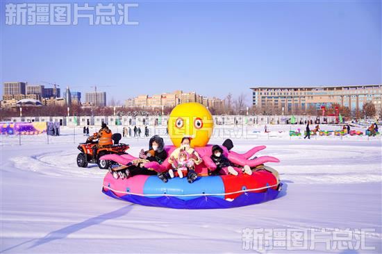 2023年1月22日,在昌吉市滨湖河冰雪主题乐园,市民玩雪上“八爪鱼”,欢度新春佳节。