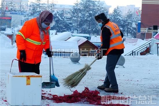 2023年1月22日,阿勒泰市环卫工人正在进行保洁作业。
