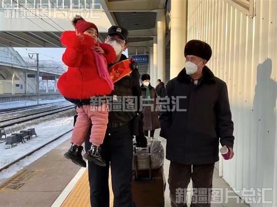2023年1月21日,农历除夕,乌鲁木齐铁路公安局乌鲁木齐公安处南站派出所“红石榴”志愿服务队队员帮助旅客出站。