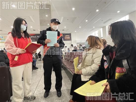 2023年1月21日,农历除夕,乌鲁木齐铁路公安局乌鲁木齐公安处南站派出所“红石榴”志愿服务队队员给乘客宣传旅途中防盗、防扒、防骗知识。