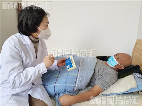 2023年1月19日,沙湾市中心敬老院的医护人员给老人讲解药品服用剂量。
