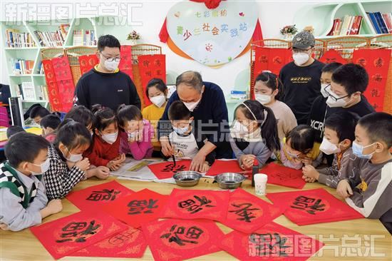 2023年1月13日,自治区书法协会会员贺开继老师为社区孩子教授书写福字。