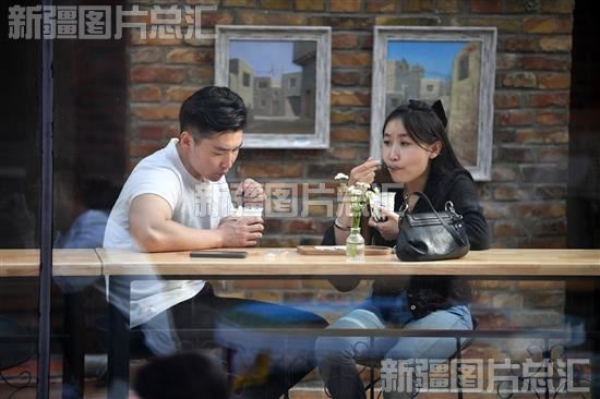 2023年4月15日,游客在伊宁市六星街景区一家民宿品味特色美食。