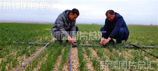 2023年4月17日,种植户在察布查尔锡伯自治县琼博拉镇琼博拉村冬小麦地铺设滴灌带。