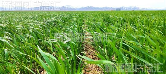 2023年4月17日,察布查尔锡伯自治县琼博拉镇琼博拉村冬小麦地,雪山下的麦苗根壮叶茂,。