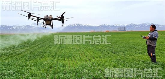 2023年4月17日,技术人员操纵无人机在察布查尔锡伯自治县琼博拉镇琼博拉村冬小麦地进行喷施作业。