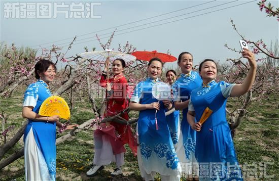 2023年4月18日,兵地演员在新疆生产建设兵团第二师22团十七连桃园里赏花拍照。