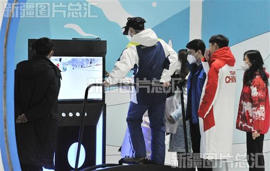 2022年12月30日,游客在冬博会现场体验模拟滑雪。
