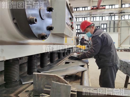 2023年4月23日,正洋(霍尔果斯)钢结构工程有限公司工作人员在霍尔果斯市南部产业园内生产钢结构配件。