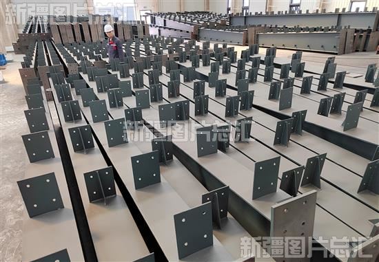 2023年4月23日,正洋(霍尔果斯)钢结构工程有限公司工作人员在霍尔果斯市南部产业园内查验产品质量。