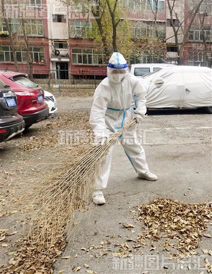 2022年11月7日,天山区南湾街街道波斯坦巷社区志愿者打扫小区卫生。
