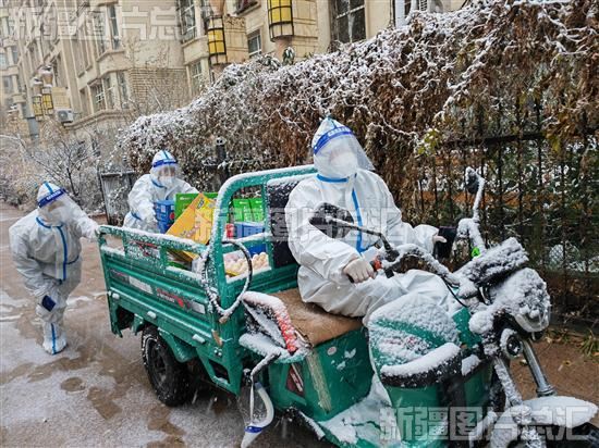 当日,乌鲁木齐迎来降雪天气,坚守在抗击疫情一线的社区干部、志愿者们舍小家为大家,冒着风雪为居民配送生活物资,服务居民。