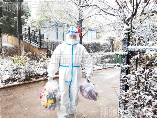 当日,乌鲁木齐迎来降雪天气,坚守在抗击疫情一线的社区干部、志愿者们舍小家为大家,冒着风雪为居民配送生活物资,服务居民。