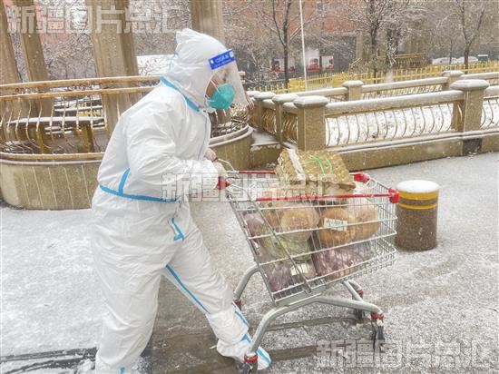 当日,乌鲁木齐迎来降雪天气,坚守在抗击疫情一线的社区干部、志愿者们舍小家为大家,冒着风雪为居民配送生活物资,服务居民。