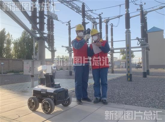 2022年10月24日,在伊宁市220千伏宁远变电站,智能巡检机器人和工作人员一起巡检,保障电网安全。