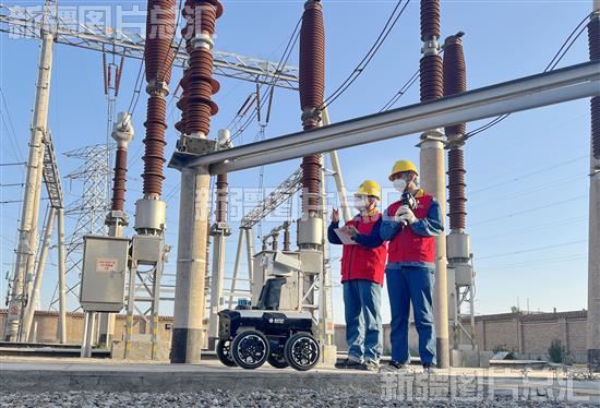 2022年10月24日,在伊宁市220千伏宁远变电站,智能巡检机器人和工作人员一起巡检,保障电网安全。