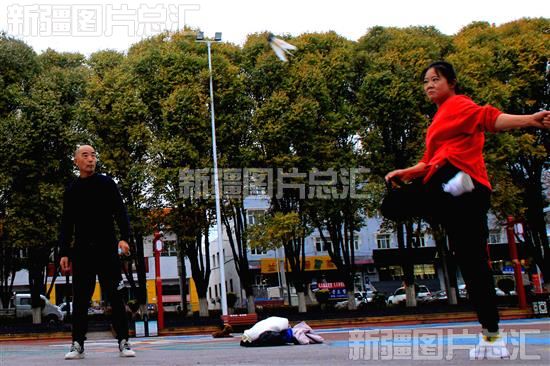 2022年10月29日,裕民县城镇居民在公园广场上踢毽子。