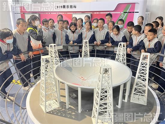 2023年4月24日,学生在库尔勒科技馆了解FAST球面射电望远镜馈源舱工作原理。