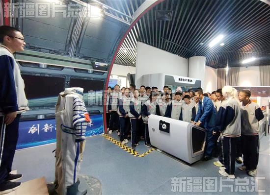 2023年4月24日,学生在库尔勒科技馆创新决胜未来展厅体验太空拍照展项。