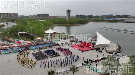 当日,库尔勒启动2023年“书香巴州·全民阅读”暨“世界读书日”活动并千人诵读《 天耀中华 》(无人机拍摄)。