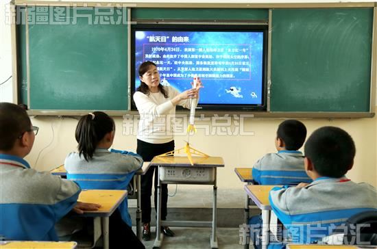 2023年4月24日,新疆生产建设兵团第二师22团中学的老师通过模型给学生介绍航天知识。