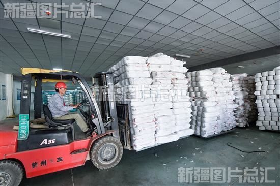 2023年4月25日,在沙雅县循环经济工业园区的阿克苏正伦实业有限公司生产车间,工人在转运产品。