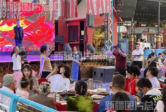 2023年5月2日,游客在位于墨玉县阿克萨拉依乡巴什库木巴格村的恩特尔沙湖旅游度假村观看演出。