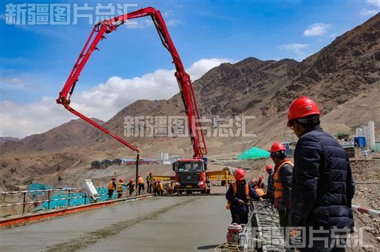 2023年5月2日,工人在哈密抽水蓄能电站1号永久大桥上浇筑桥面。