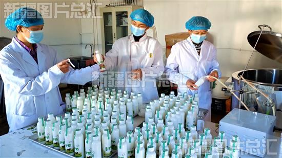 2023年5月1日,察布查尔锡伯自治县爱新舍里镇乌珠牛录村崔氏农场员工将高温杀菌后的鲜驴奶装瓶冷藏。