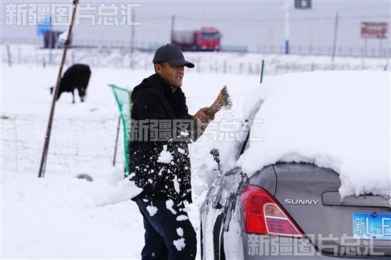 2023年5月2日,牧民清理车辆上的积雪。