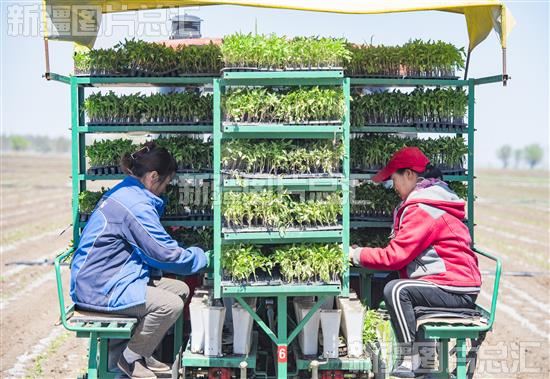 2023年5月4日,吉木萨尔县老台乡老湖村种植户驾驶番茄移栽机在大田里移栽番茄苗。