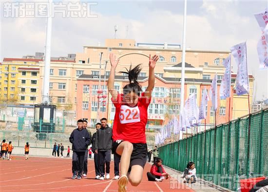 2023年5月4日,在2023年新疆阿勒泰地区第十届中小学生田径运动会上,参赛选手在进行三级跳远比赛中。