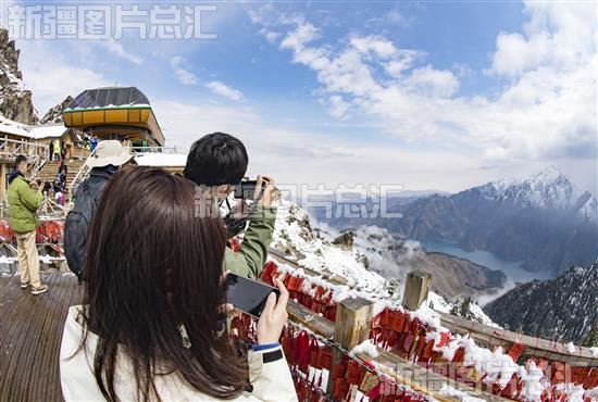 2023年5月2日,游客位于天山天池西南处的马牙山景点拍照。