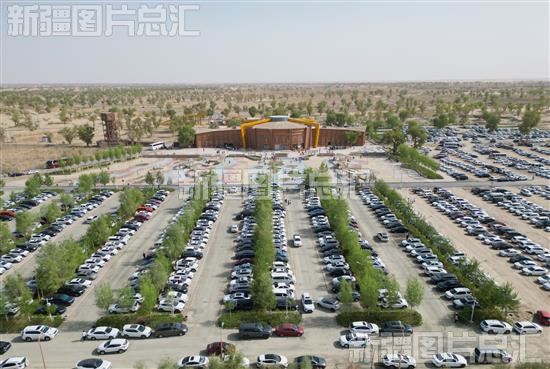 2023年5月1日,尉犁县罗布人村寨景区停车场,停满了前来旅游的车辆。(无人机拍摄)。
