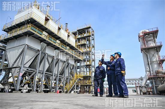 2023年5月6日,工人在位于呼图壁县工业园新材料园区的新疆峻宇锂离子电池炭黑导电剂项目建设现场对设备进行巡查。