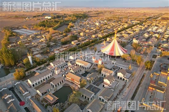 2023年5月5日,落日余晖下的克拉玛依市乌尔禾区“西部乌镇”(无人机拍摄)。在“西部乌镇”项目的带动下,2022年乌尔禾区农牧民人均纯收入达到4万余元,2022年村集体收入达到8000余万元。
