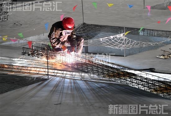 2023年5月5日,工程人员在乌尔禾晶品硅基产业园新建车间内施工。该基地用地总面积26万平方米,总建筑面积17.8万平方米,计划5月底完工。