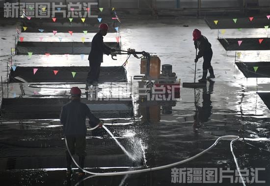 2023年5月5日,工人在乌尔禾硅基新材料产业园生产车间里施工。该产业园位于克拉玛依市乌尔禾区百口泉产业园区,计划5月底完工。