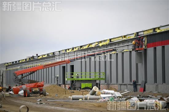 2023年5月5日,工程人员在乌尔禾晶品硅基产业园新建车间外施工。该基地用地总面积26万平方米,总建筑面积17.8万平方米,计划5月底完工。