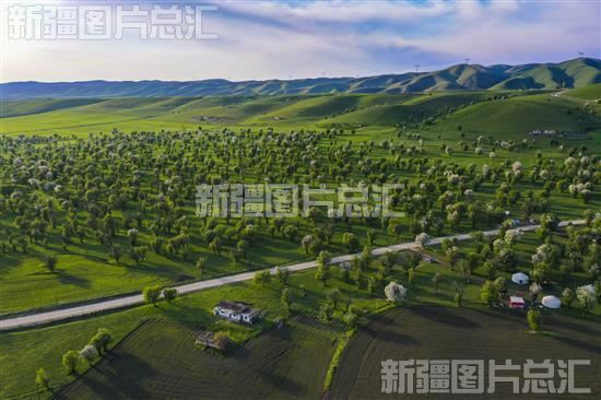 2023年5月6日,远眺新源县喀拉布拉镇萨哈景区中的万亩野生苹果林(无人机拍摄)。