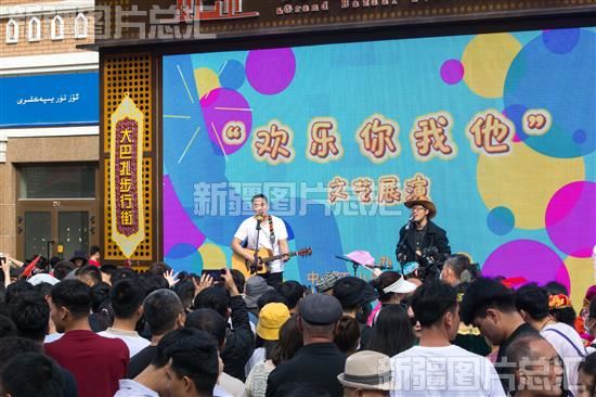 2023年4月30日,游客在新疆国际大巴扎景区正在欣赏歌曲。
