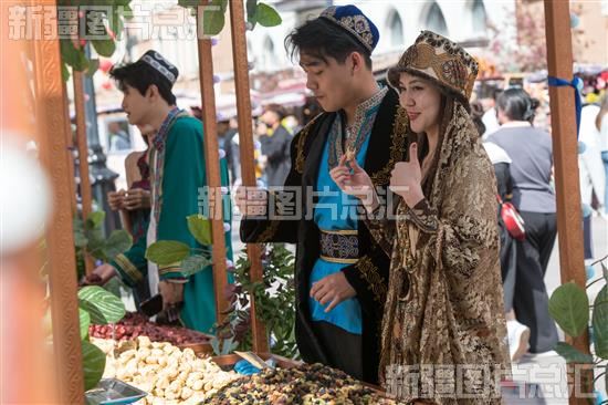 2023年4月30日,游客在新疆国际大巴扎景区游客品尝干果。